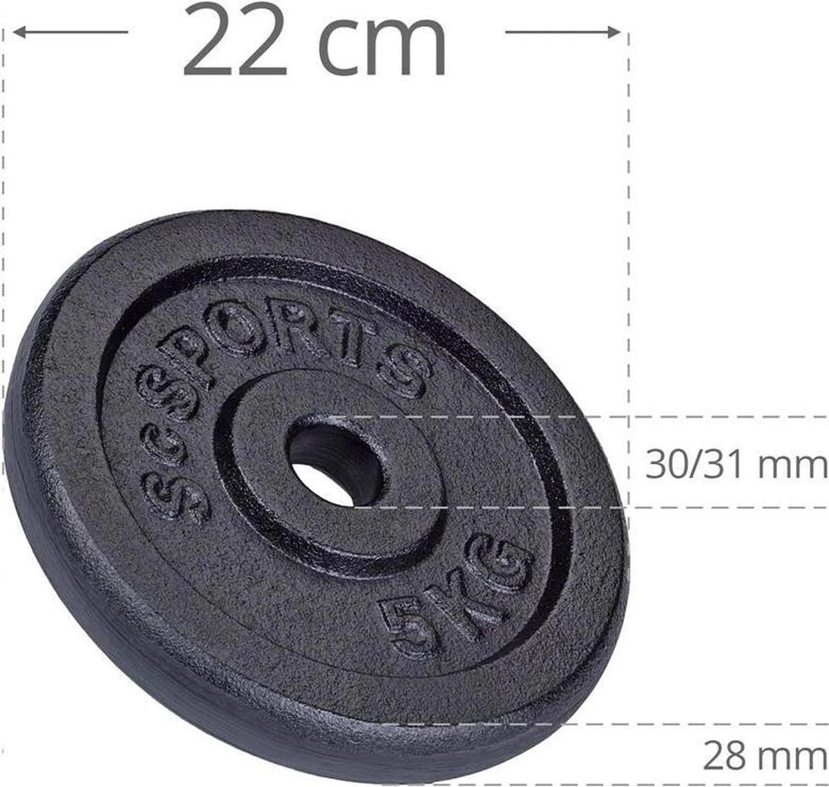– Afmetingen 5 kg halterschijf: Ø ca. 22 cm, dikte ca. 2,8 cm