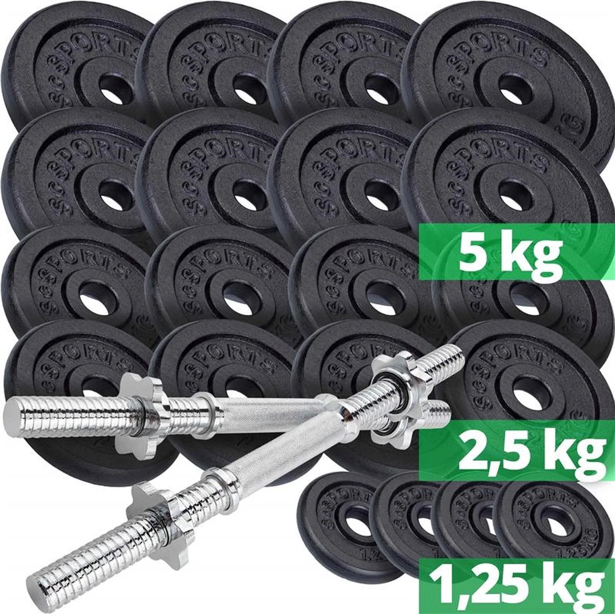 Halterset van 70 kg, bestaande uit twee korte halterstangen (2,6 kg per stuk) en 8 x 5 kg, 8 x 2,5 kg en 4 x 1,25 kg halterschijven, gietijzer, 30 mm